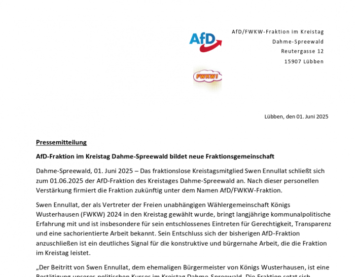 Lübben, 18. Mai 2022. Im Rahmen der Kreistagssitzung wurde über die neue Zuteilung der Ausschüsse des Kreistages entschieden. Seitens der CDU/FDP/Bauern sollte dies der neu gegründeten Fraktion der AfD verweigert werden.